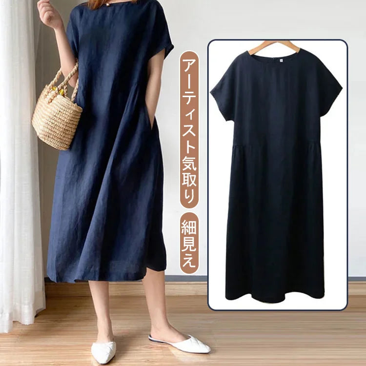 【コットンリネン無地ワンピース】細見え コットンリネン ゆっとり 爽やか 肌に優しい