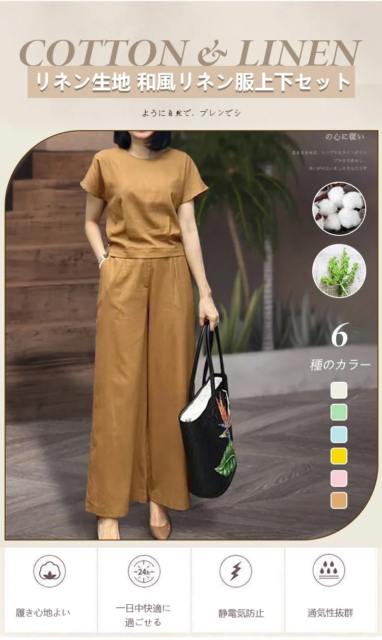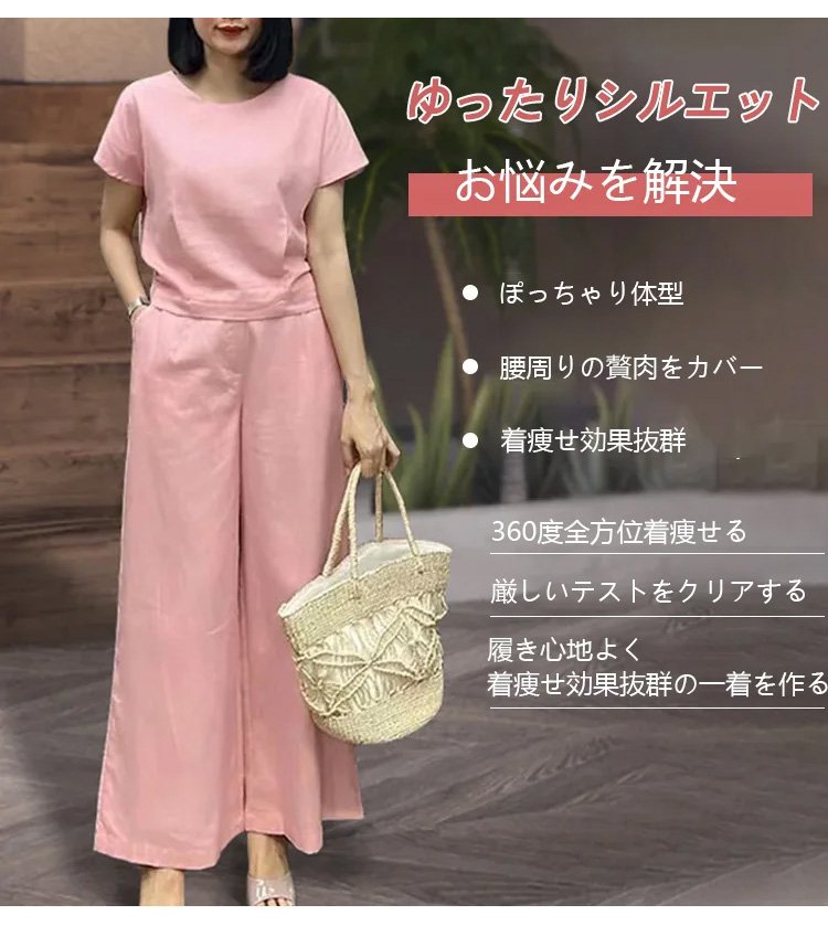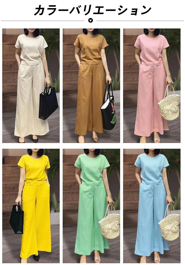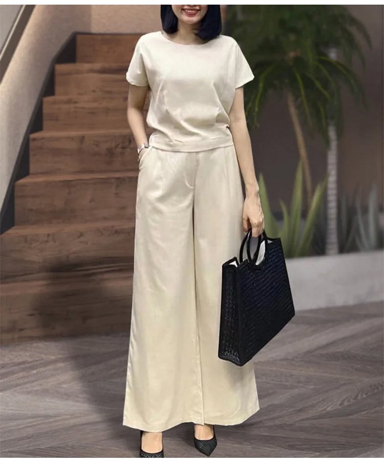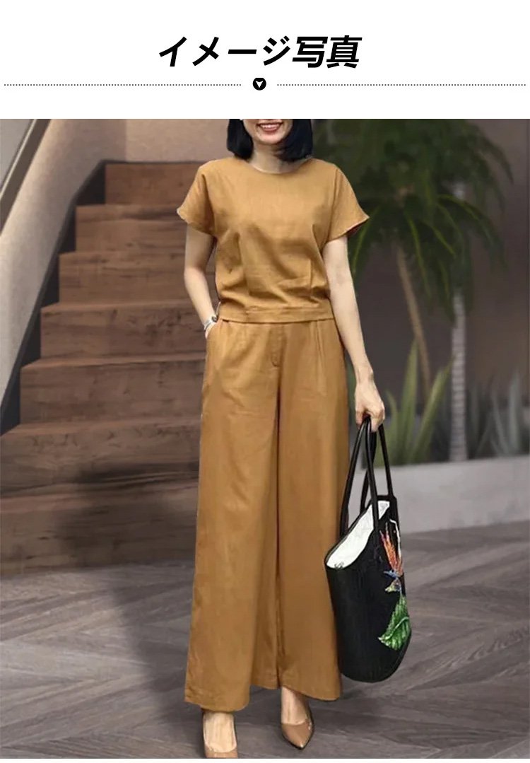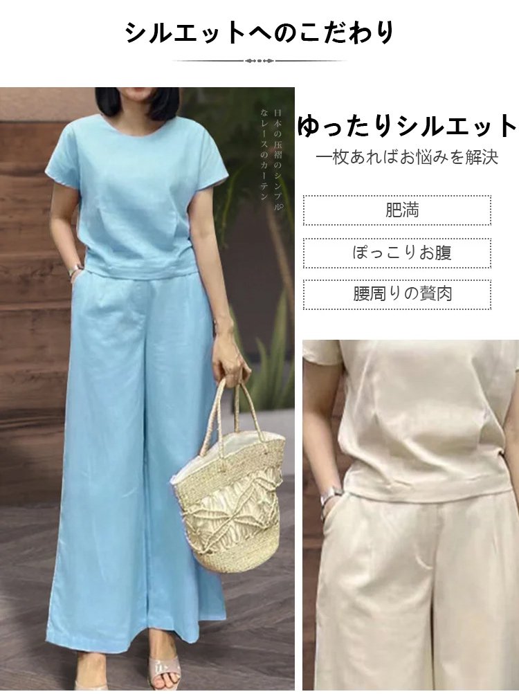リネン半袖Tシャツ+9分丈ワイドパンツ上下セット