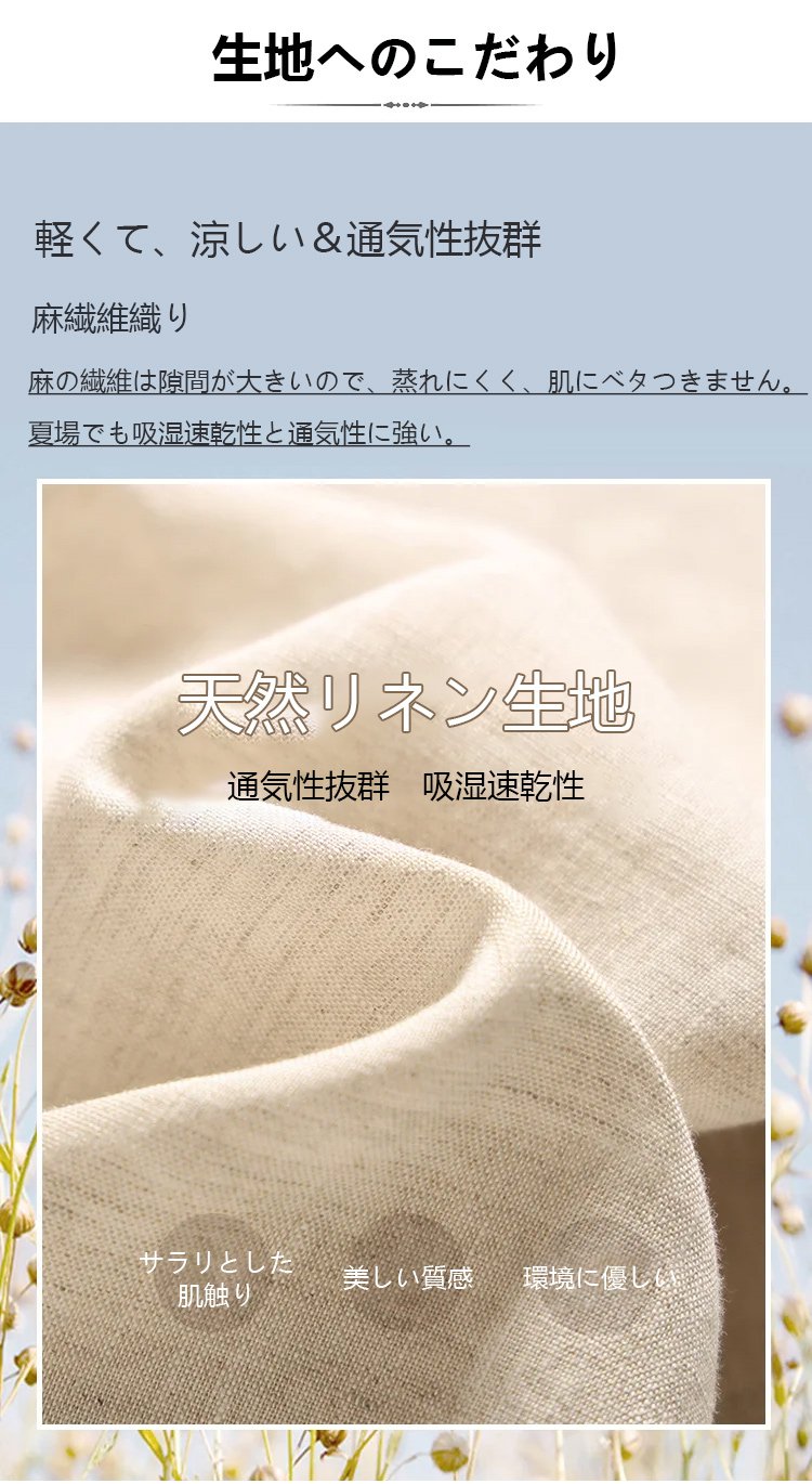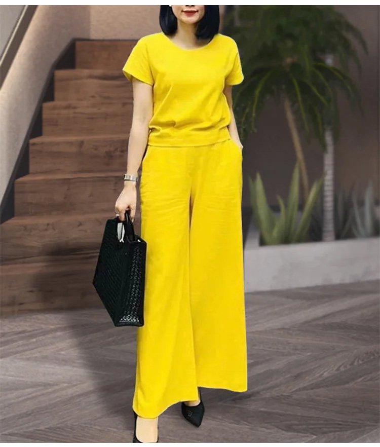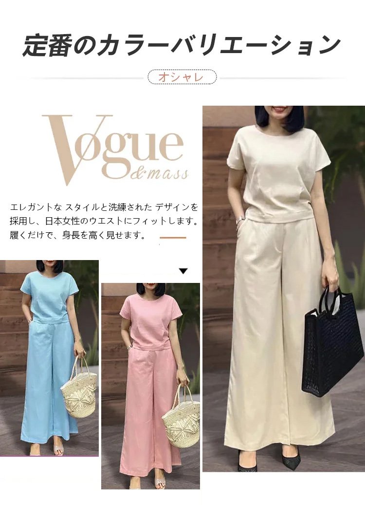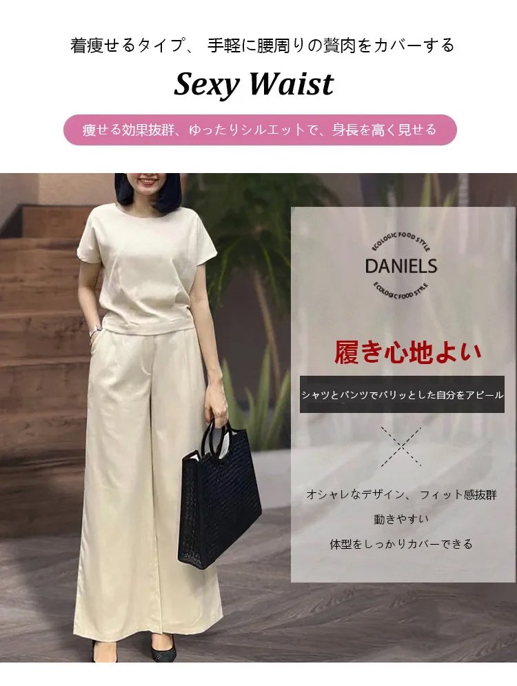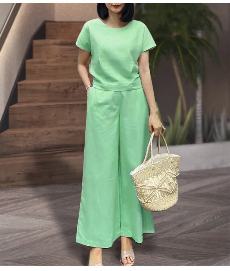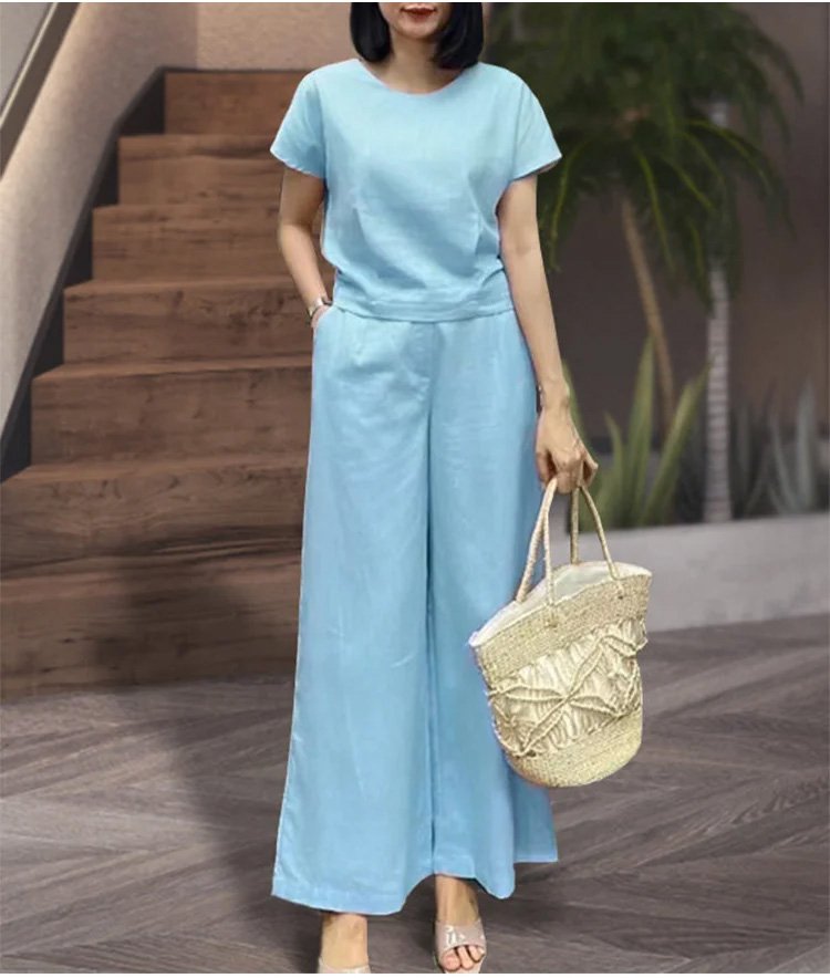 リネン半袖Tシャツ+9分丈ワイドパンツ上下セット
