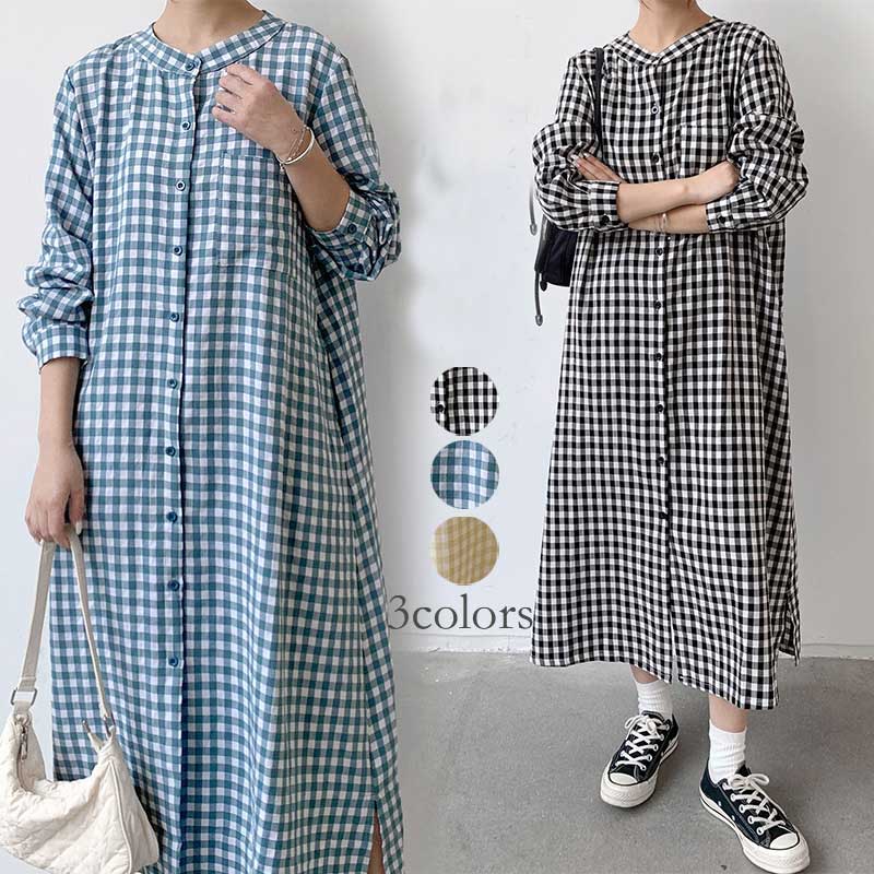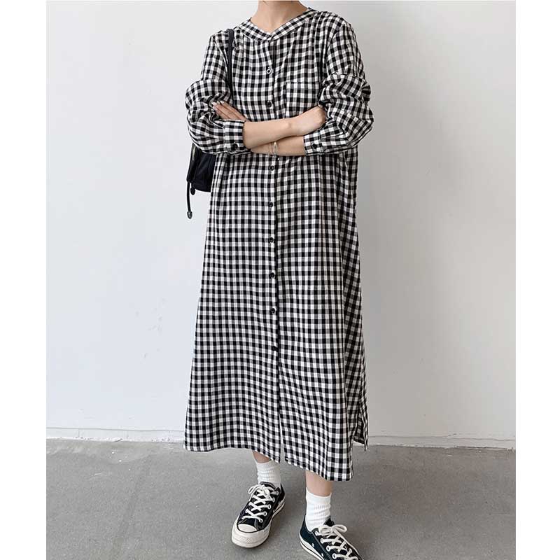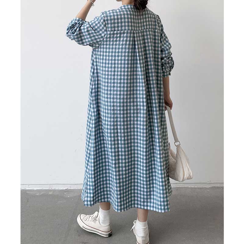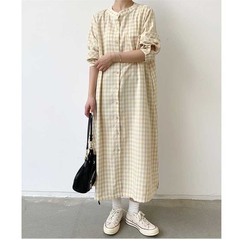 韓国風ファッション チェック柄シャツワンピース おしゃれロングワンピース